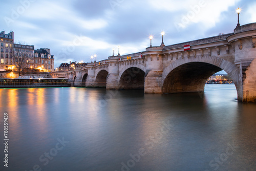 bridge Pont Neuf and Seine river with old houses, Paris, France, toned