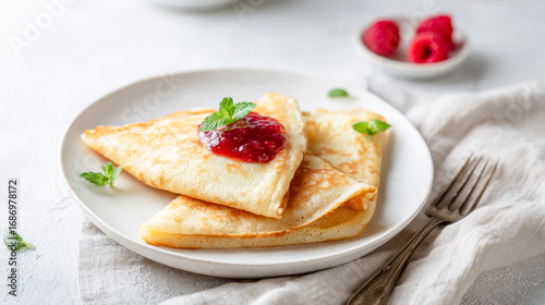 Bright and airy food styling with thin pancakes topped with raspberry jam and mint