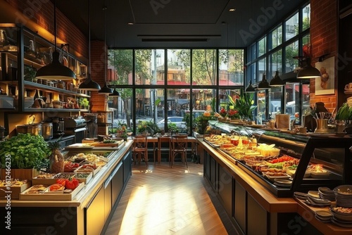 Bright and cozy restaurant interior with large windows, well-lit food display counters featuring fresh vegetables, salads, and various dishes, wooden furniture and green plants