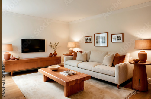 Bright and cozy room with a large, comfortable sofa, natural wood coffee table, and soft, warm-toned decor. Scandinavian home interior design of modern living room.