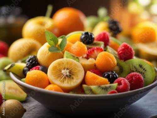 fruit, berry, salad, health food, fresh fruit, juicy fruit, orange, banana, kiwi, raspberry, blueberry, blackberry, mint, tropical fruit, healthy snack, bright colors, illustration