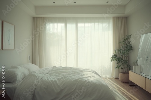 bedchamber, interior, design, home, decor, minimalism, light, curtain, furniture, soft, plant, cosy, bedding, white, peaceful, relaxing, contemporary, floor, space, modern, calmness, lifestyle, natural, window, wall, warm, aesthetic, sleep, furnishing, atmosphere, refreshing, accessory, clean, stylish, retreat, environment, sanctuary, simplicity, fresh, calm, elegant, view, collection, arrangement, comfort, brightness, serenity