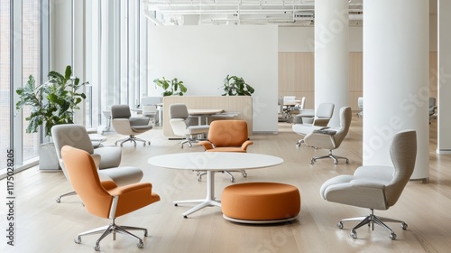 Bright and minimalist modern office with circular table and comfortable seating arrangements