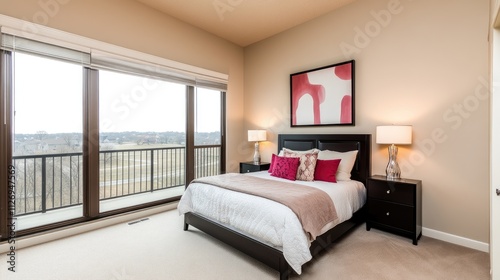 Bright and Modern Bedroom with Large Windows Offering Scenic Views and Contemporary Decor