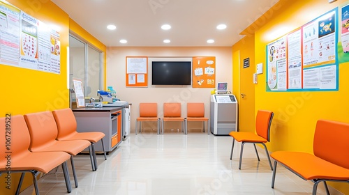 Bright and modern waiting area in a healthcare facility with orange chairs and informative posters on the walls.