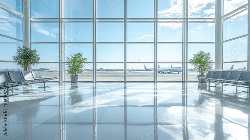 Bright and Open Airport Terminal Interior with Large Windows and Polished Floors, Featuring Minimalist Design, Ample Seating, and Natural Light—Perfect for Themes of Modern Travel and Transportation