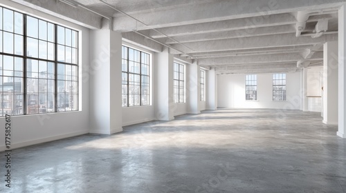 Bright and Spacious Empty Industrial Loft Interior with Polished Concrete Floors and Large Windows
