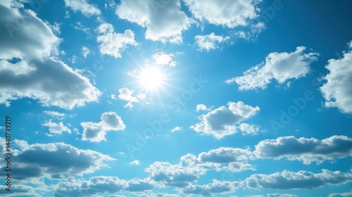 Bright blue sky with fluffy white clouds under the shining sun, creating a serene and uplifting atmosphere for nature lovers.