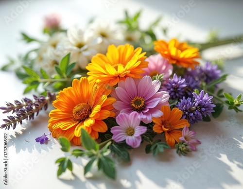Bright bouquet with orange, pink and purple flowers. Fresh green leaves and lavender sprigs surround colorful blossom arrangement. Delicate floral mix.