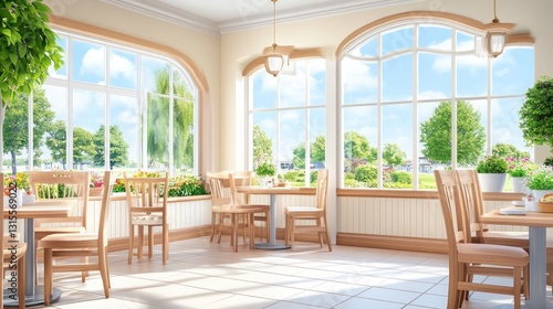 Bright cafe interior with tables and chairs overlooking a summer garden under a blue sky, suitable for dining