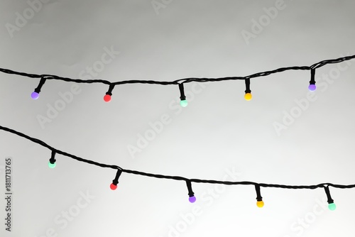 Bright Christmas lights on grey background, closeup