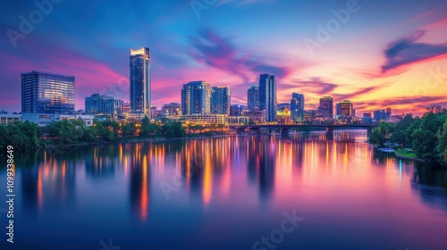 Bright city skyline at dusk, lights reflecting on river, vibrant colors, bustling and energetic, urban nightlife