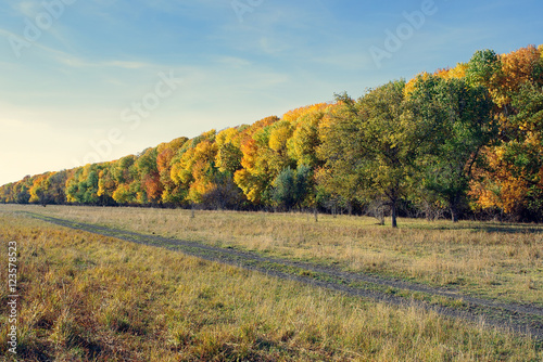 autumn, bright, colourful, gold, grove, landscape, line, orange, red, road, tree, yellow