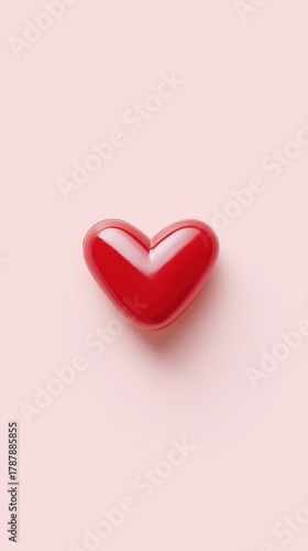 Bright crimson heart with gloss shine, Glossy scarlet heart against gentle pastel background, Lustrous crimson heart set on delicate pink surface emphasizing passion and intimacy symbol
