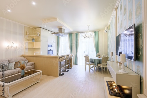interior, living room, kitchen, modern, elegant, bright, light, white, blue, wallpaper, furniture, sofa, table, chair, island, chandelier, curtain, fireplace, television, decor, design, home, apartment, luxury, style, contemporary, flooring, cabinet, shelf, lighting, window, cushion, vase, artwork, decoration, hood, oven, microwave, counter, ornament