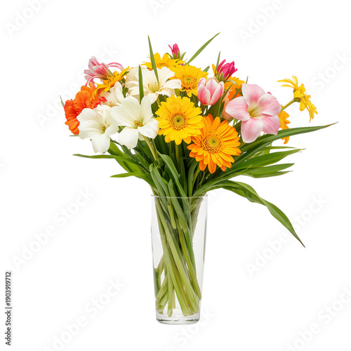Bright Flowers in a Clear Glass Vase Arranged on a White Background
