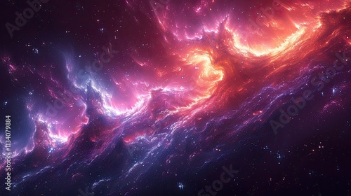 Bright glowing nebula in deep cosmic space with vibrant orange and purple celestial clouds.