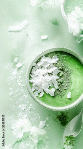 matcha, smoothie, bowl, coconut, flake, breakfast, healthy, fresh, green, antioxidant, vitamin, nourishment, fiber, detox, organic, natural, wellness, energy, refreshing, creamy, vibrant, aesthetic, trendy, plated, epicure, homemade, minimal, light, vegan, vegetarian, raw, wholesome, delicious, clean, morning, well-being, tropical, digestion, metabolism, bright