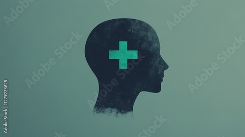 Bright Green Plus Icon Centered in Silhouette of Head Symbolizing Mental Positivity in Vector Style for Wellness and Health Themes