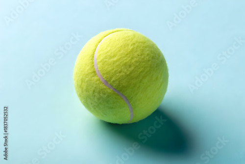 Bright green tennis ball placed on a soft teal surface in minimal style.Sports tennis ball.