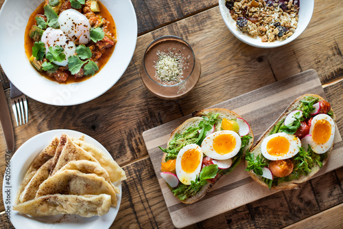 avocado, breakfast, egg, food, granola, mexican, smoothie, still life, table, toast, wood