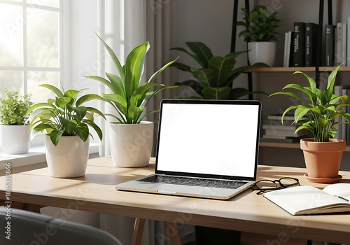 Bright Home Office Desk with Blank Laptop Screen, Houseplants, & Natural Sunlight. Modern, Cozy Workplace Interior for Study & Remote Work