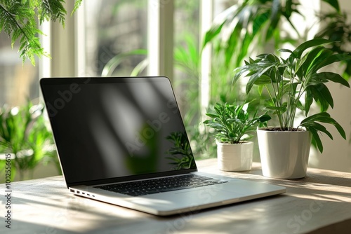 laptop, computer, desk, office, home, working, work, business, technology, cyberspace, design, workspace, houseplant, window, light, shadow, sunny, nobody, empty, blank, screen, indoor, wood, table, communication, freelance, modern, minimal, interior, comfortable, cosy, day, morning, evening