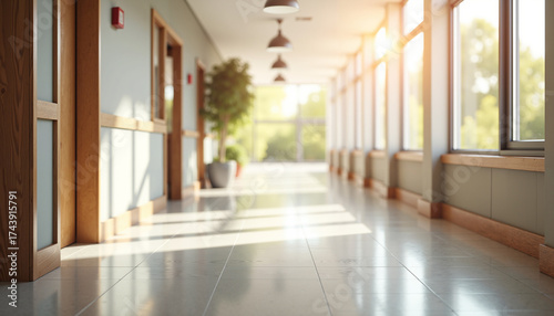 Bright hospital corridor with sunlight illuminating green plants