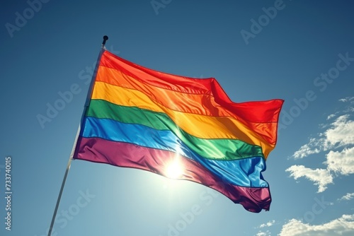 Bright LGBT flag fluttering against blue sky, space for text. Lesbian concept