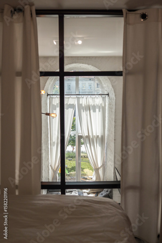 window, arch, loft, interior, light, natural, curtain, white, fabric, glasses, modern, minimal, home, apartment, bright, cosy, room, soft, sunlight, architecture, urban, elegant, design, indoor, scenic, view, outside, greenery, grass, city, peaceful, living, comfort, open, lifestyle, vertical, daylight, relaxation, symmetry, decor, privacy, textile, warm, stylish, calm, airy, aesthetic, contemporary