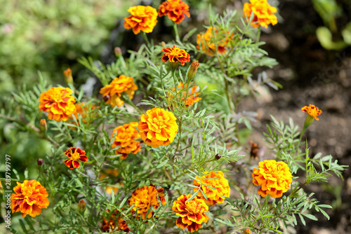 Bright marigolds bloom in the summer garden on a sunny day
