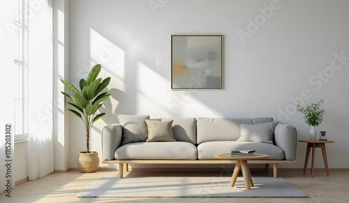 Bright, minimal living room featuring a light gray sofa, wooden furniture, abstract wall art, potted plants, and natural light streaming through large white-curtained windows.