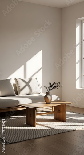 living, room, white, sofa, cushion, wooden, hot drink, table, vase, plant, natural, light, shadow, minimalist, modern, interior, decor, bright, calm, relaxing, home, contemporary, stylish, simple, clean, neutral, wall, sunlight, floor, window, sunshine, sun, warm, comfortable, aesthetic, interior design, lifestyle