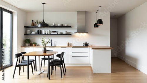 kitchen, dining table, interior, interior design, home interior, wooden floor, kitchen utensile, table setting, natural light, contemporary, bright, clean, minimalism, home, house, apartment, residence, domestic life, lifestyle, furniture, room, indoor, decoration, decor, style, design, architecture, property, real estate, living space, cookware, plate, utensil, vase, plant
