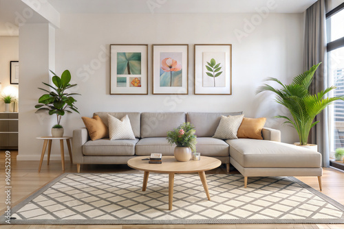 Bright Modern Living Room with Beige Sofa, Colorful Throw Pillows, Round Wooden Coffee Table, Framed Art, Geometric Rug and Potted Plants