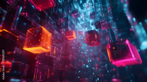 bright, neon, geometric, shape, floating, dark, cube, colours, vibrant, light