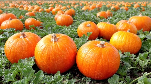 Bright orange pumpkins fill the patch, thriving in the warm autumn sunlight, ready for Halloween celebrations ahead