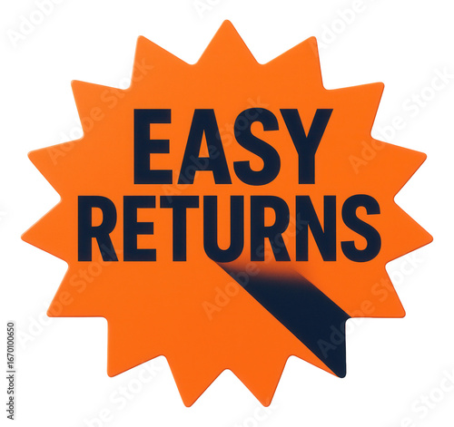 Bright orange starburst sticker with EASY RETURNS offer in bold font, appealing retail promo sticker on transparent background.
