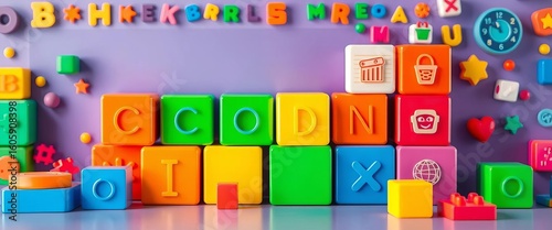 Bright, playful coding interface with colorful blocks and icons, app, technology