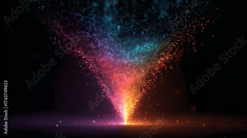 Bright rainbow colored particles ascend in a glowing vortex formation against a dark backdrop