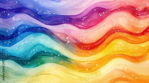 Bright rainbow waves flowing gently, watercolor-like texture with delicate white dots and cosmic starry glow