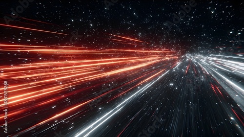 Bright red and white light trails streak rapidly through a dark starry space.