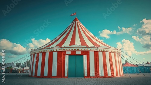 Bright red and white striped circus tent under clear blue sky, festive carnival scene, amusement attraction, vibrant daytime celebration, summer event, cheerful fairground