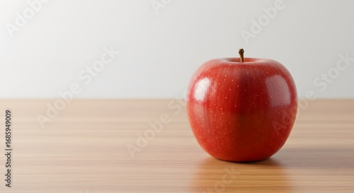 Bright red apple with stem sits on a wooden surface against a white wall in bright lighting. Closeup view.
