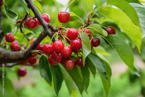 bright, tree branch, green leaf, ripe, fresh, nature, fruit, closeup, vibrant, fruit farm, healthy, agriculture, summer, harvest, organic, juicy, delicious, outdoors, garden, growth, foliage, seasonal, natural, plant, farm, food, cherry tree, gardening, botany, lush, tree, fruit tree, leaf, sweet, countryside, rural, farm fresh, produce, sunny, environment, refreshing, diet, red, cherry, berry, tree branch, berry