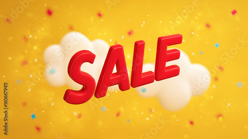 Bright red sale sign against a vibrant yellow background with colorful confetti creating a festive atmosphere