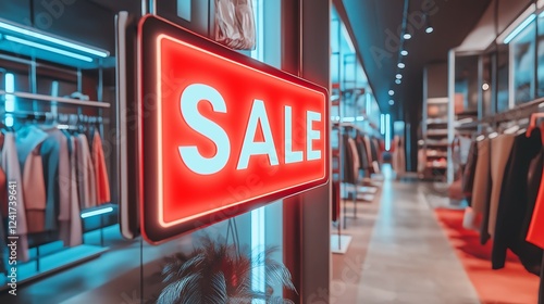 Bright red sale sign draws attention in modern retail store showcasing fashionable clothing and accessories