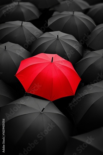umbrella, red, black, group, individuality, uniqueness, contrast, standout, different, colours, bright, dark, crowd, pattern, rain, weather, protection, object, arrangement, concept, symbolism, inspiration, opposition, striking, urban, design, artistic, style, identity, courage, bold, abstract, composition, visual, highlight, center, sharpened, defiance, metaphor, distinct, creative, statement
