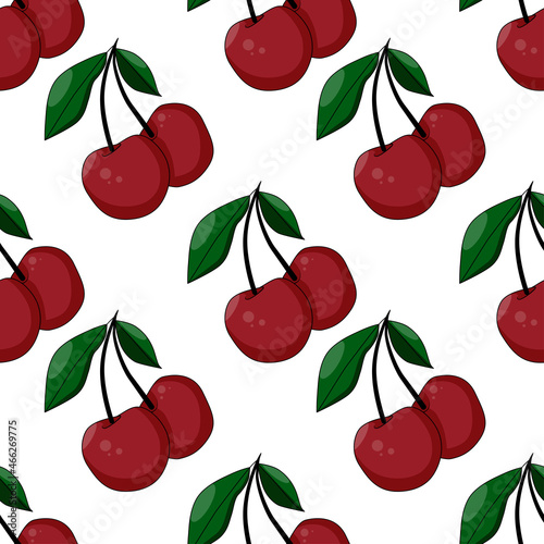 Bright ripe cherries in cartoon style with black outline seamless pattern on white background.