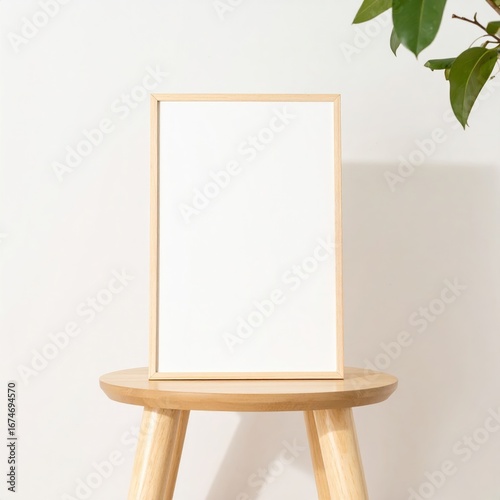 Bright Scandinavian Mockup Blank Vertical Wood Frame on a Stool with a Touch of Greenery.
